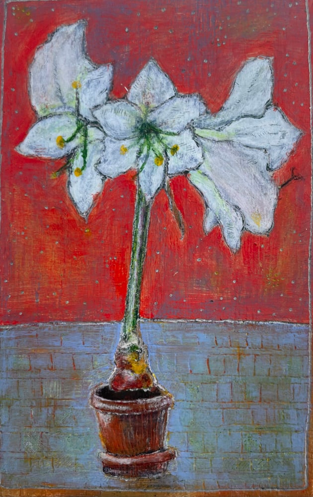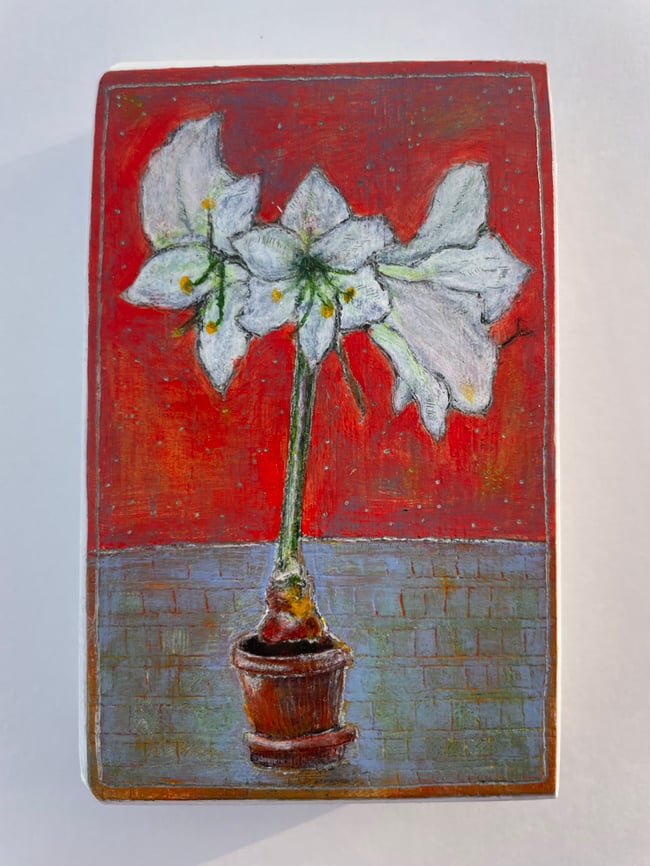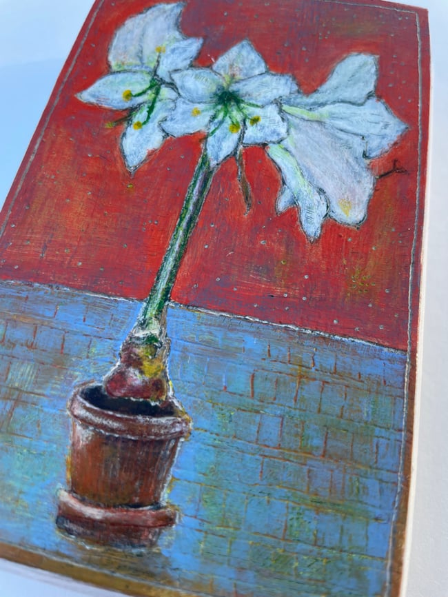 My process began by layering gesso on oak boards. I then made an observational drawing with my carving tool. After the initial carving was done I layered paint and carved until the painting was finished.