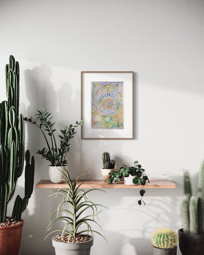 This piece is from a series abstract drawings I made while living in Charlottesville, VA. I was reflecting on my relationship to community and playing with new media. My process involves a lot of layers, often beginning with a simple pattern and then intuitively layering onto the design that emerges until the final image begins to show itself. The process is very healing and joyful—I never know what a final image will look like when I begin!