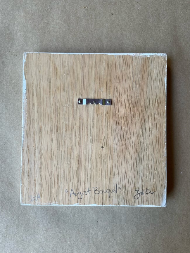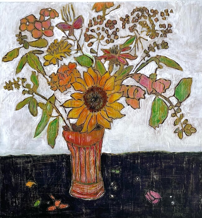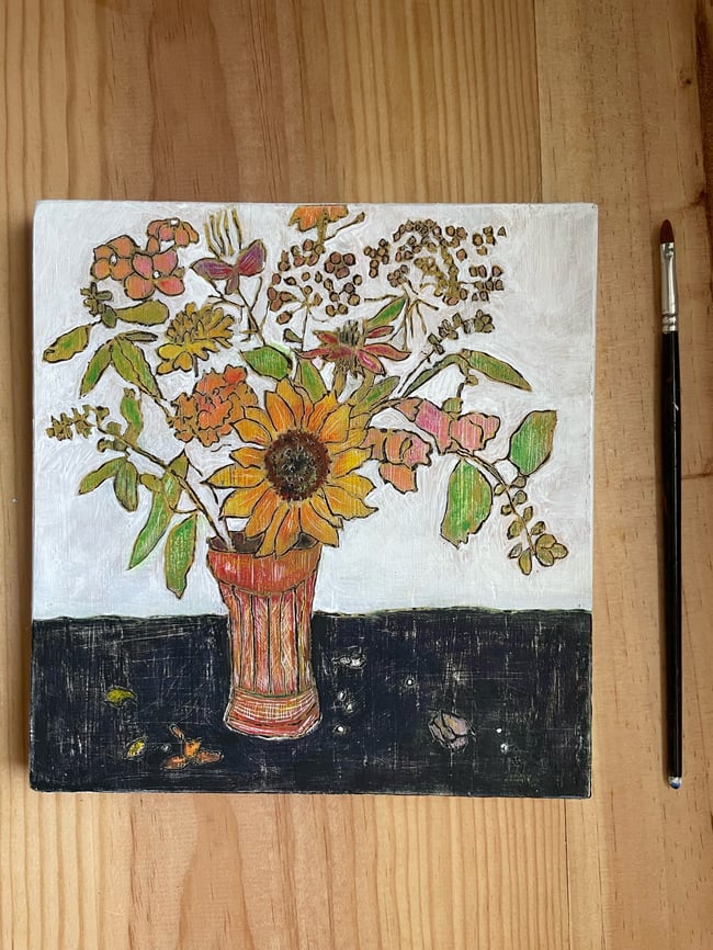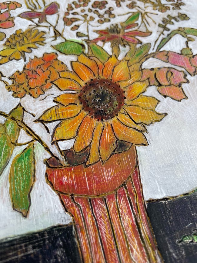 My process began by layering gesso on oak boards. On this clean white surface, I made an observational drawing of the arrangement. Then, using a wood burner, I engraved the bouquet into the board and sanded it to create a clean surface to paint on. Next, I brought the image to life with acrylic paint and colored pencil. My final step was to scratch fine details into the painting with an x-acto knife.