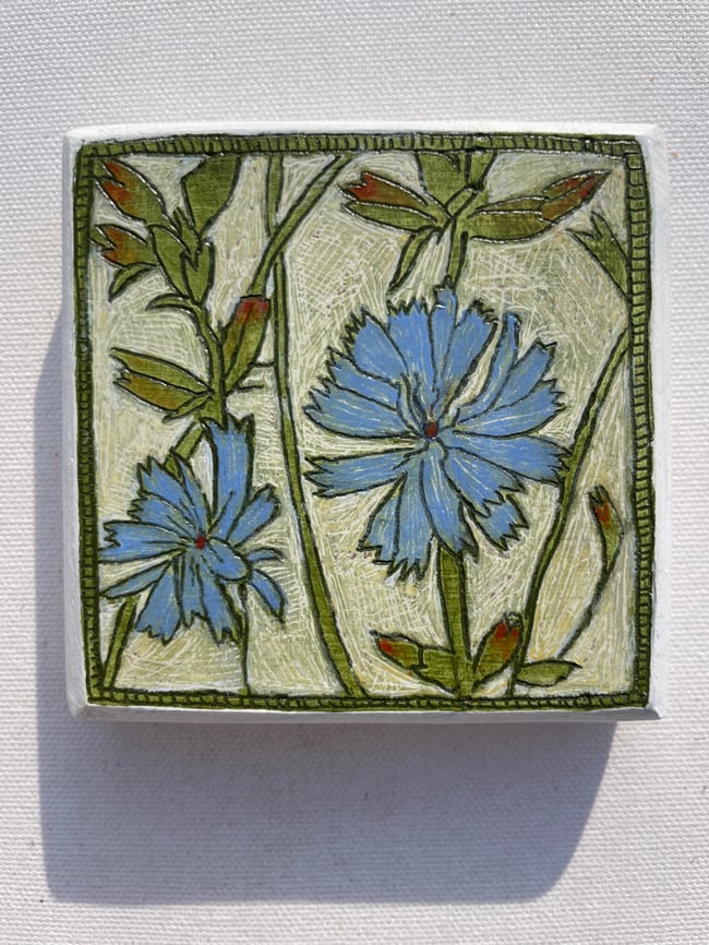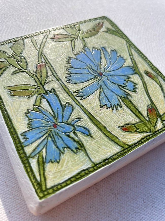 My process began by layering gesso on an oak board. I then made and observational drawing with my carving tool. After the initial carving was done I layered paint and carving until the painting was finished.