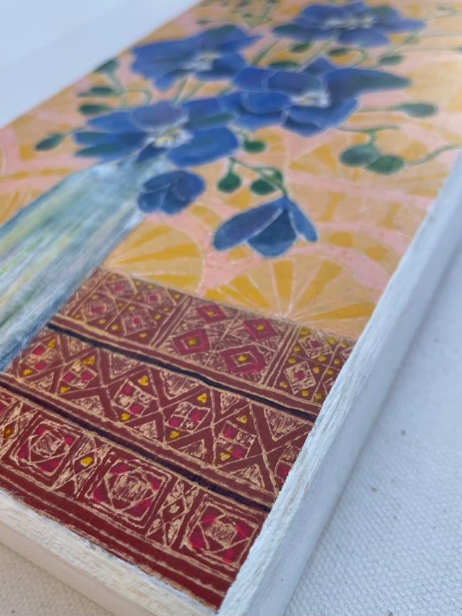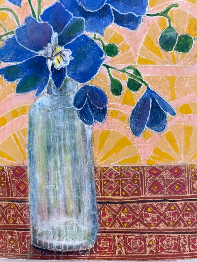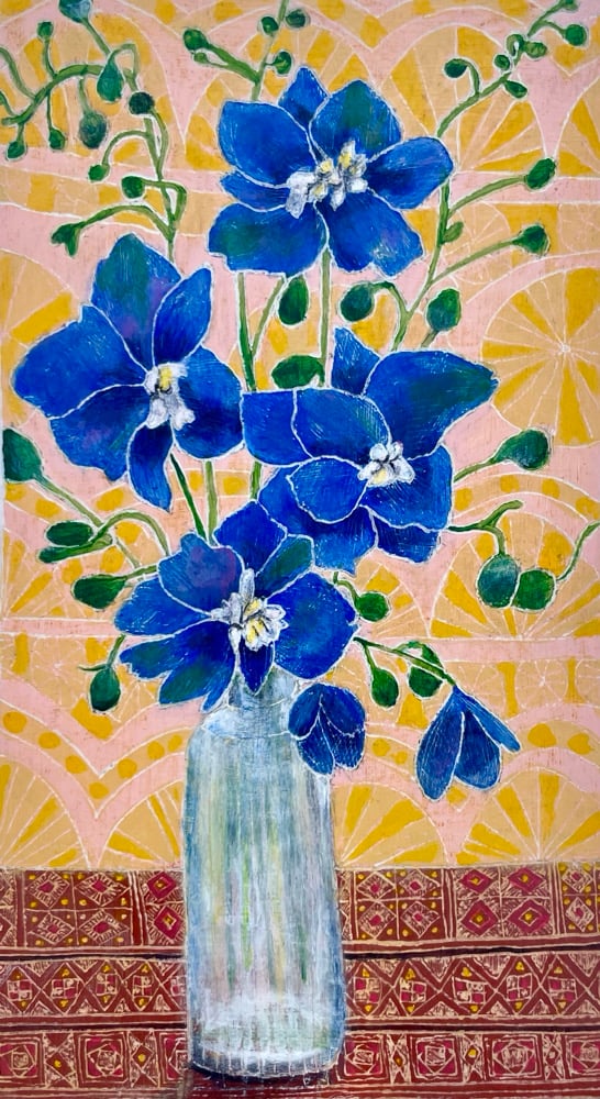 This carved painting was inspired by a joyful bouquet of delphinium flowers I harvested from my garden in early July.