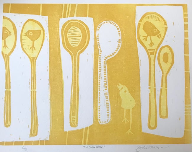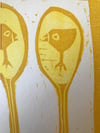 This print was made at Penland School of Crafts, NC. I carved the drawings on to two pieces of wood and then layered them to make the final image. My inspiration came from memories of little chicks on my parents' farm growing up.