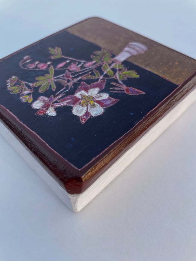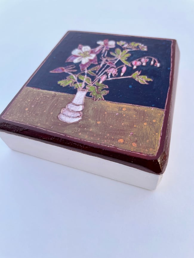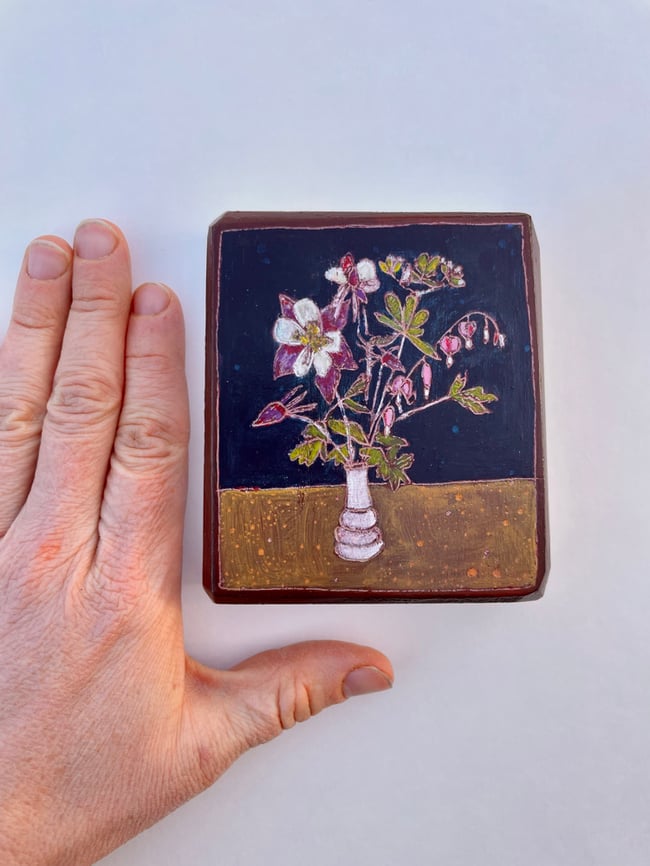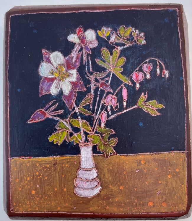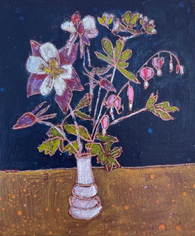 When I was a little girl my Grandma would take me to the back yard every spring and show me her flowering Bleeding Heart plant. We would delight in the way the flowers came apart and hid a secret white heart on the inside. This painting was inspired by a bouquet I harvested from my own garden. Every year when the Bleeding Hearts bloom I think of Grandma Flo