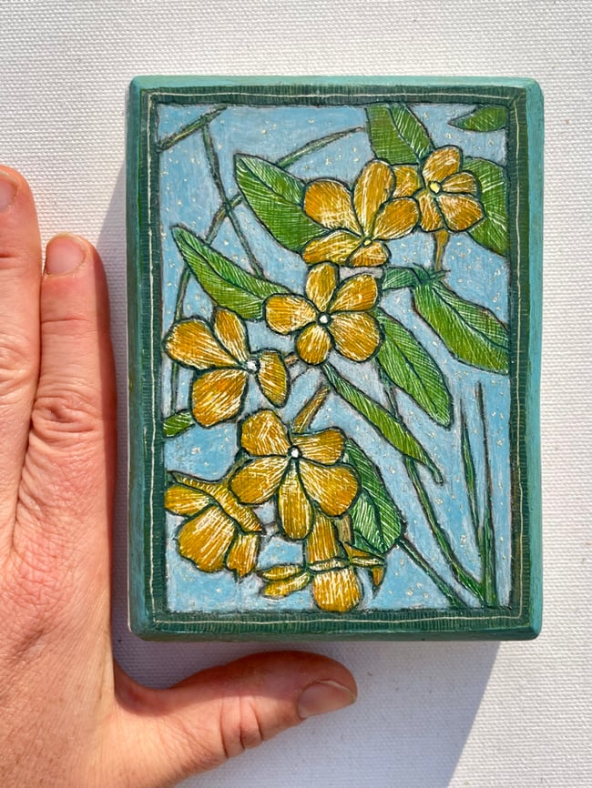 My process began by layering gesso on an oak board. I then made and observational drawing with my carving tool. After the initial carving was done I layered paint and carving until the painting was finished.