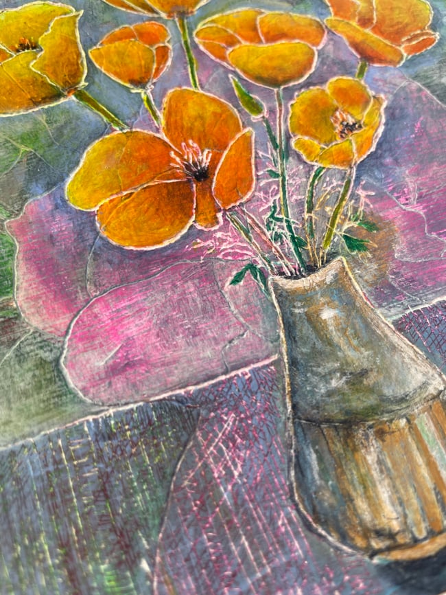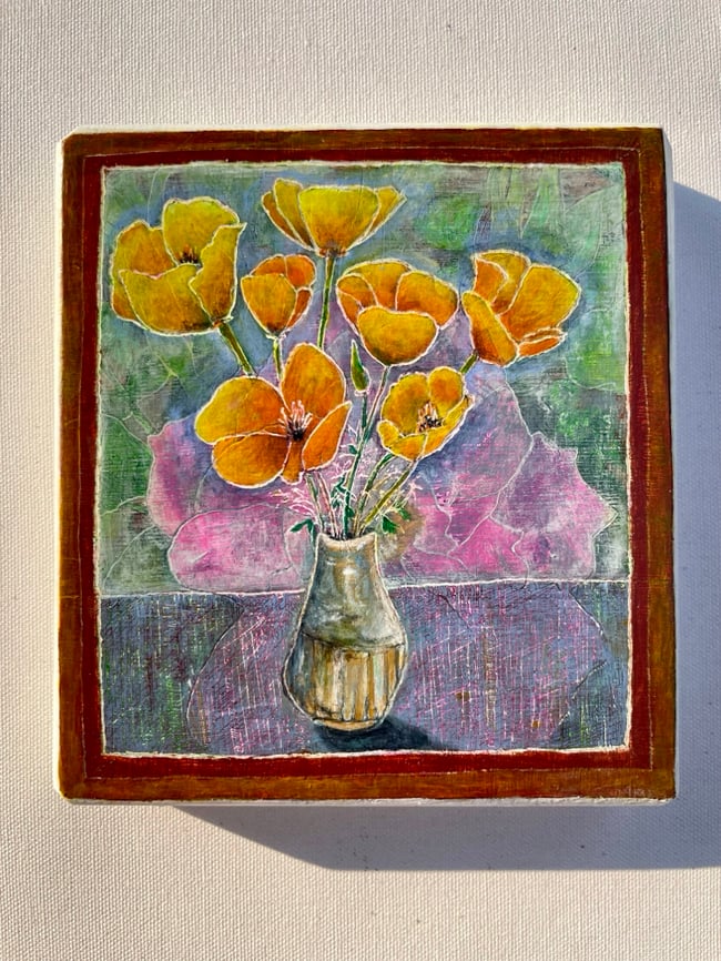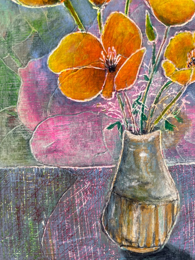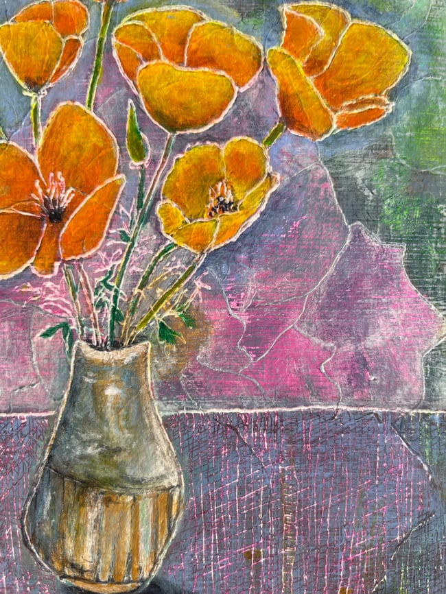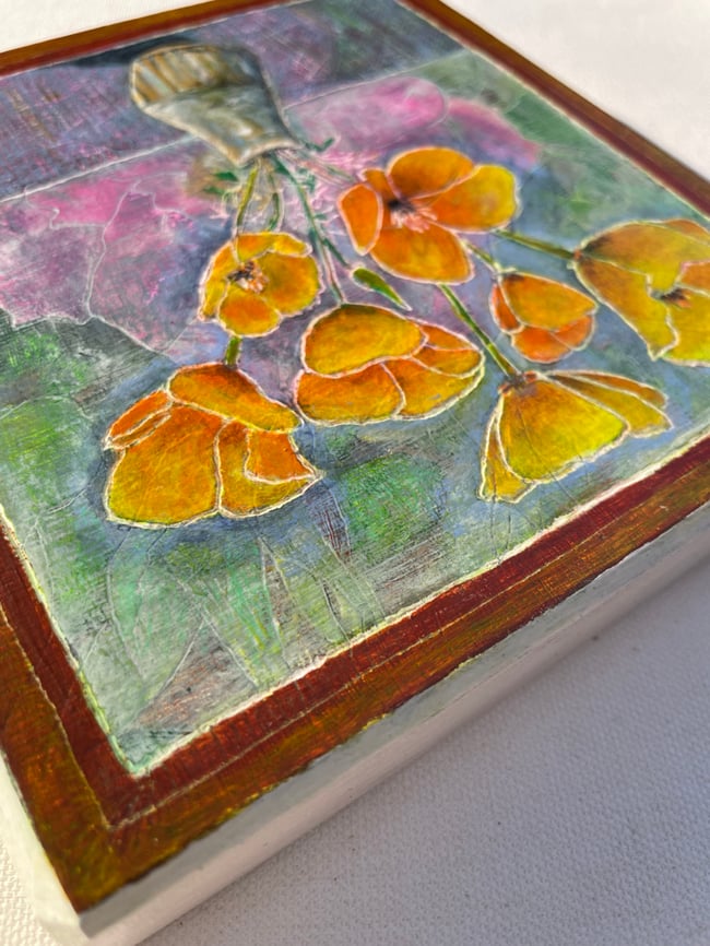 This carved painting was inspired by flowers from my garden harvested in early June.