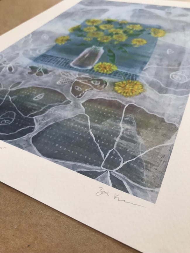 Inspired by a bouquet of dandelions, this print is an archival reproduction of a mixed media painting.