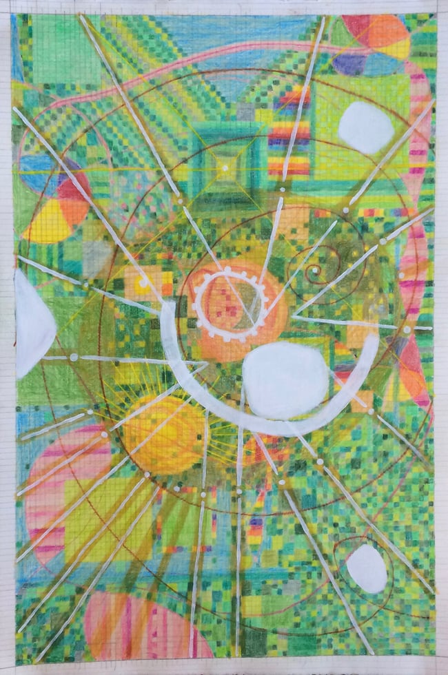 This piece is from a series abstract drawings I made while living in Charlottesville, VA. I was reflecting on my relationship to community and playing with new media. My process involves a lot of layers, often beginning with a simple pattern and then intuitively layering onto the design that emerges until the final image begins to show itself. The process is very healing and joyful—I never know what a final image will look like when I begin!