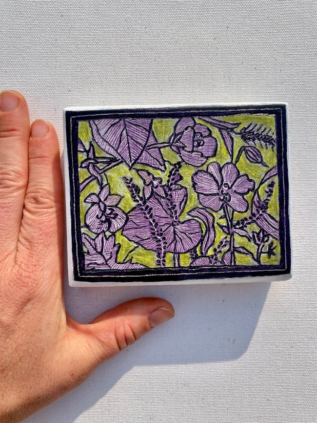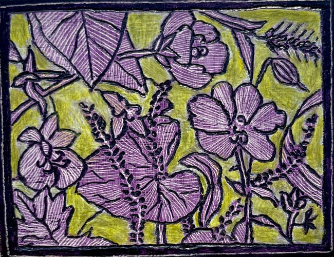 My process began by layering gesso on an oak board. I then made and observational drawing with my carving tool. After the initial carving was done I layered paint and carving until the painting was finished.