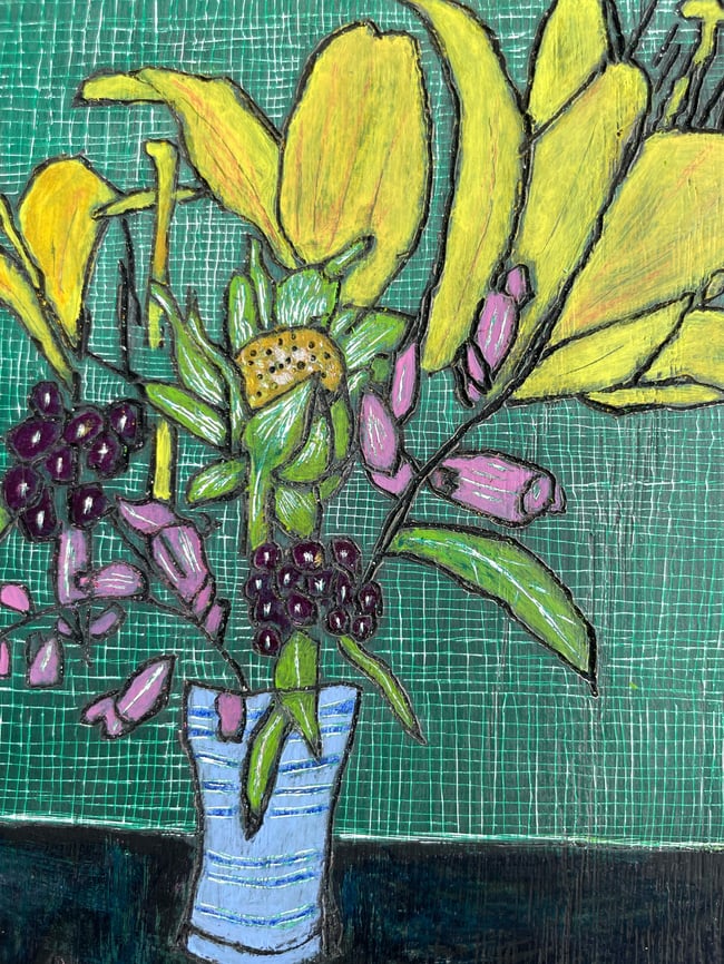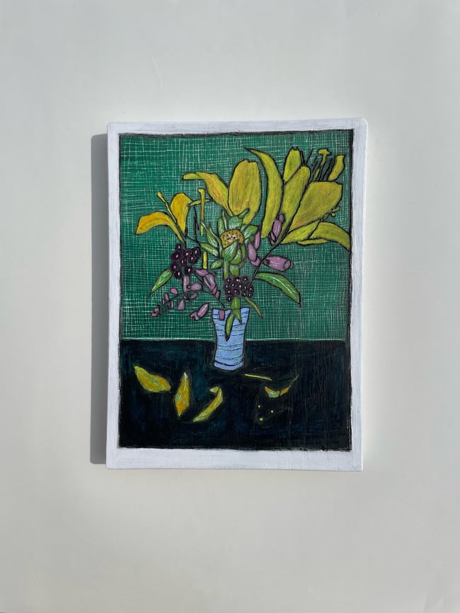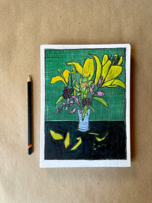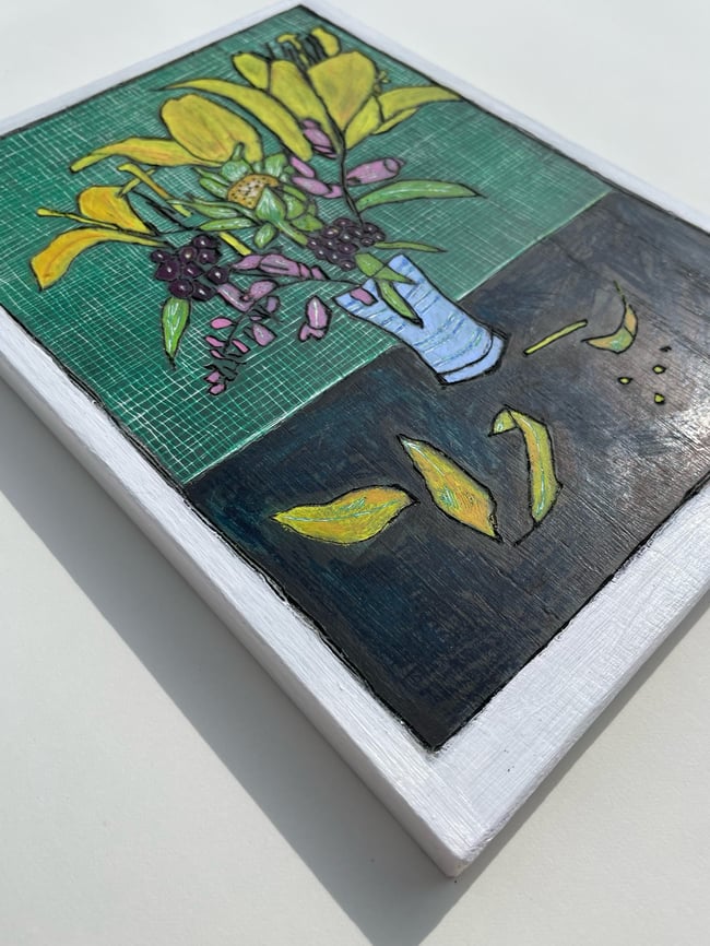 My process began by layering gesso on oak boards. On this clean white surface, I made an observational drawing of the arrangement. Then, using a wood burner, I engraved the bouquet into the board and sanded it to create a clean surface to paint on. Next, I brought the image to life with acrylic paint and colored pencil. My final step was to scratch fine details into the painting with an x-acto knife.
