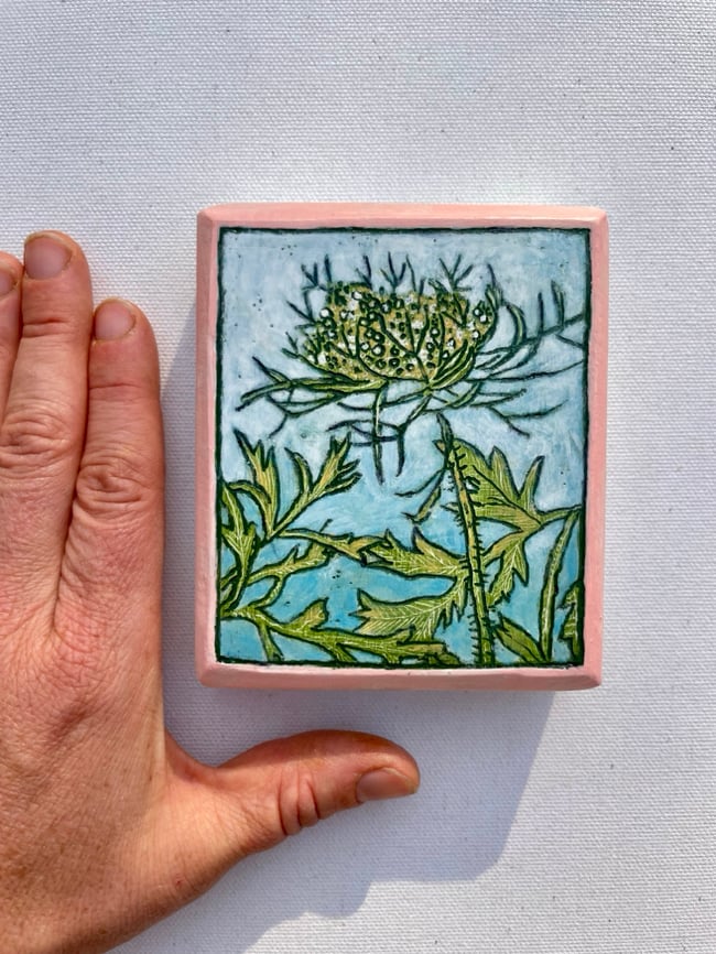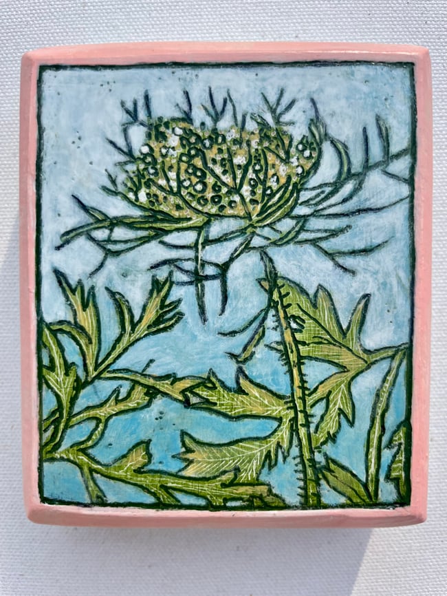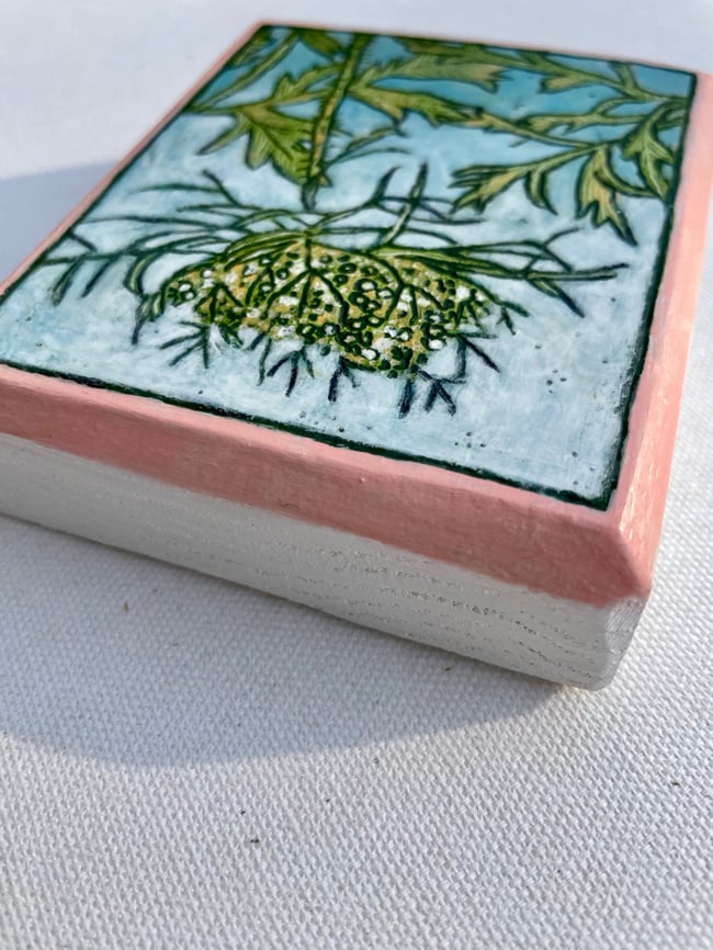 My process began by layering gesso on an oak board. I then made and observational drawing with my carving tool. After the initial carving was done I layered paint and carving until the painting was finished.