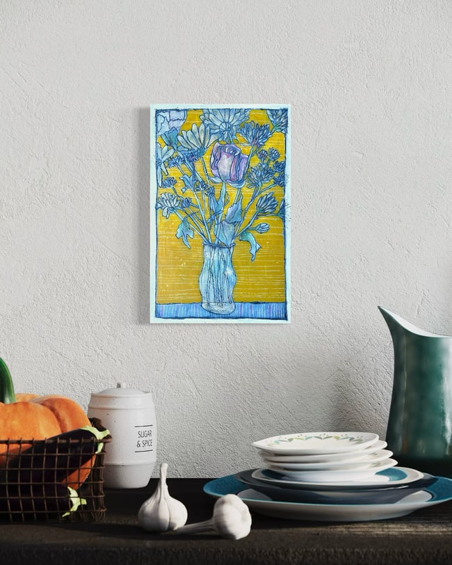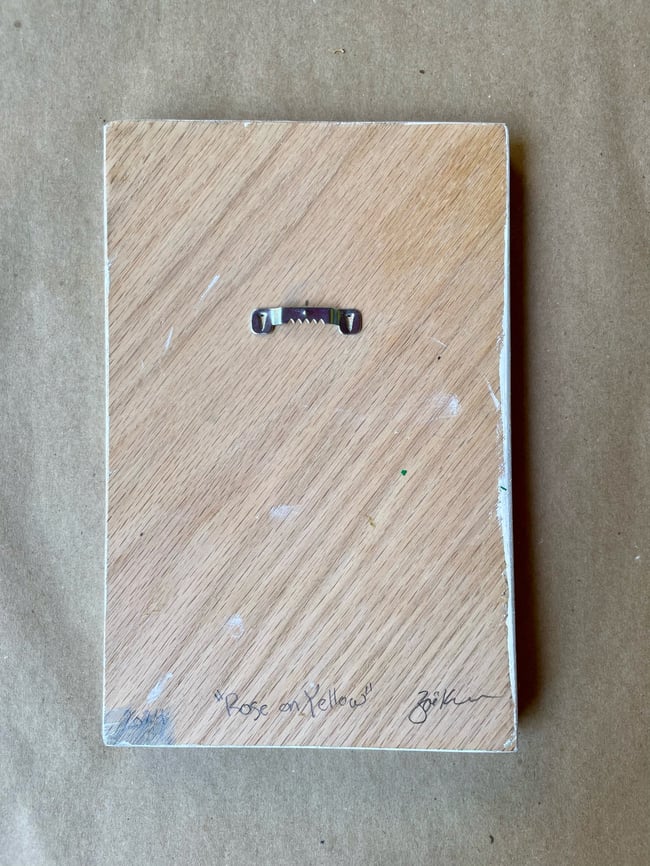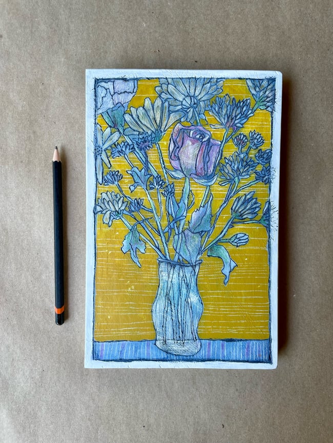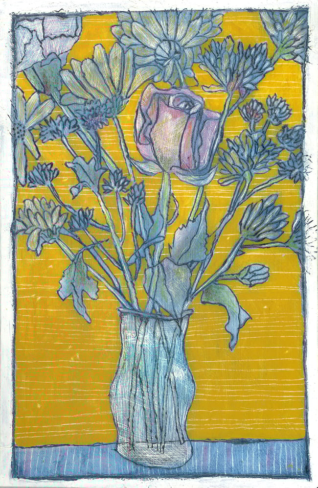 My process began by layering gesso on oak boards. On this clean white surface, I made an observational drawing of the arrangement. Then, using a wood burner, I engraved the bouquet into the board and sanded it to create a clean surface to paint on. Next, I brought the image to life with acrylic paint and colored pencil. My final step was to scratch fine details into the painting with an x-acto knife.