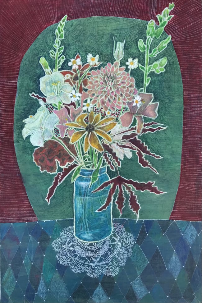 My inspiration was to explore and celebrate the improvisational asymmetries embodied by my garden. This "September Bouquet" painting was specifically inspired by an arrangement made by a local flower farm, Oak and Olive Flowers.