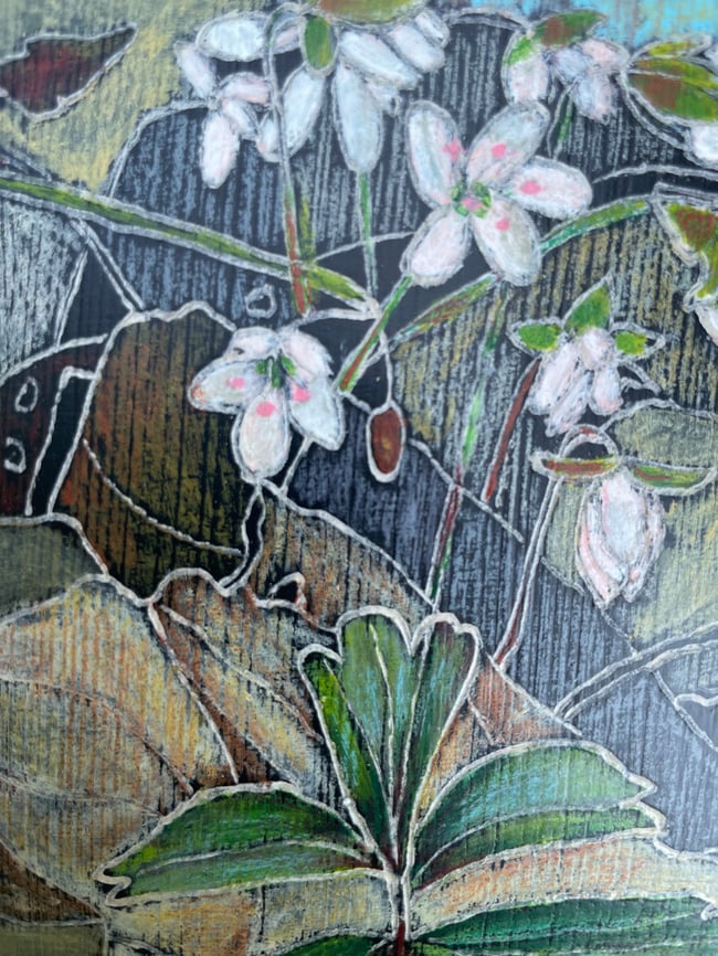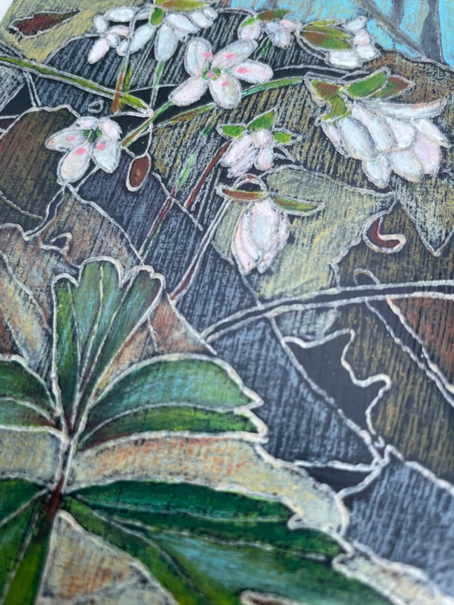 My process began by layering gesso on aspen boards. On this black surface, I made an observational drawing of the arrangement with a carving tool. Next, I brought the image to life with acrylic paint and colored pencil. My final step was to scratch fine details into the painting with an x-acto knife.