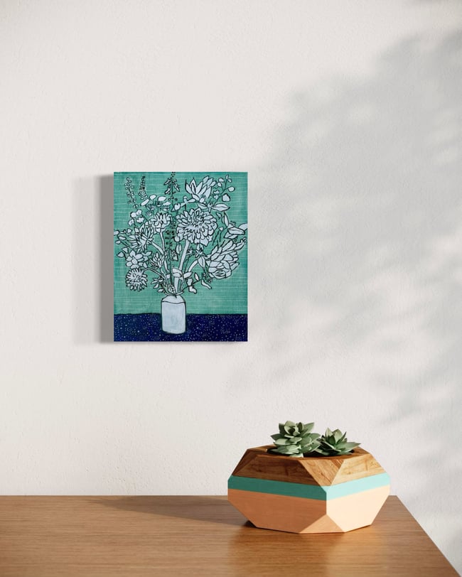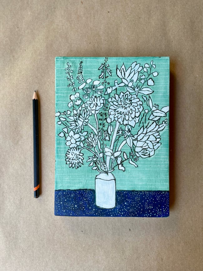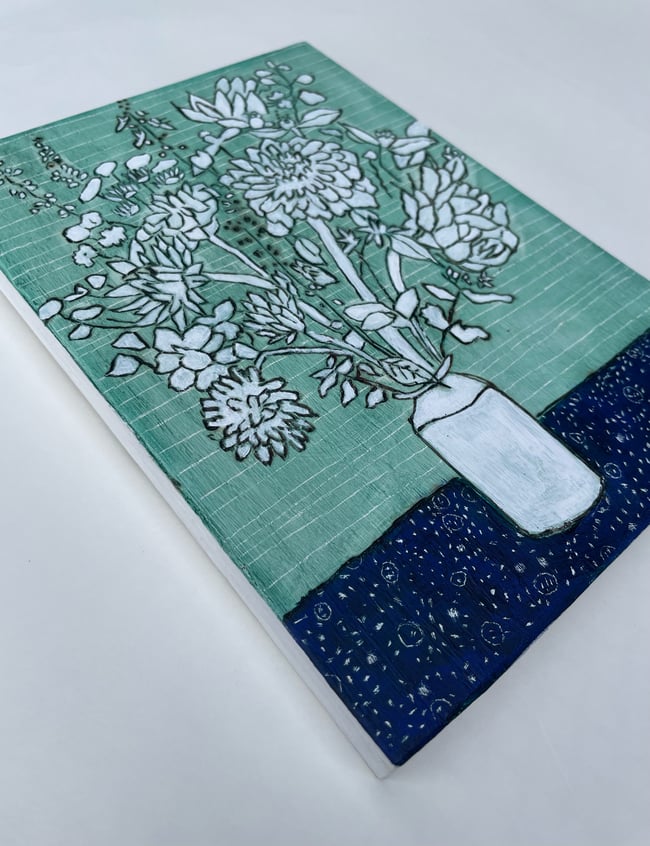 My process began by layering gesso on oak boards. On this clean white surface, I made an observational drawing of the arrangement. Then, using a wood burner, I engraved the bouquet into the board and sanded it to create a clean surface to paint on. Next, I brought the image to life with acrylic paint and colored pencil. My final step was to scratch fine details into the painting with an x-acto knife.