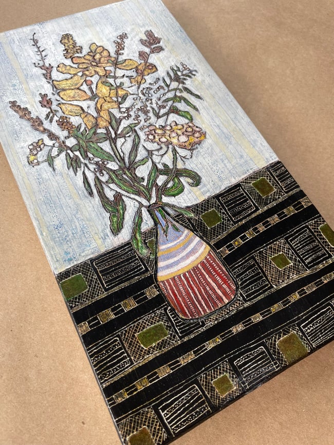 My process began by layering gesso on oak boards. On this clean white surface, I made an observational drawing of the arrangement. Then, using a wood burner, I engraved the bouquet into the board and sanded it to create a clean surface to paint on. Next, I brought the image to life with acrylic paint and colored pencil. My final step was to scratch fine details into the painting with an x-acto knife.