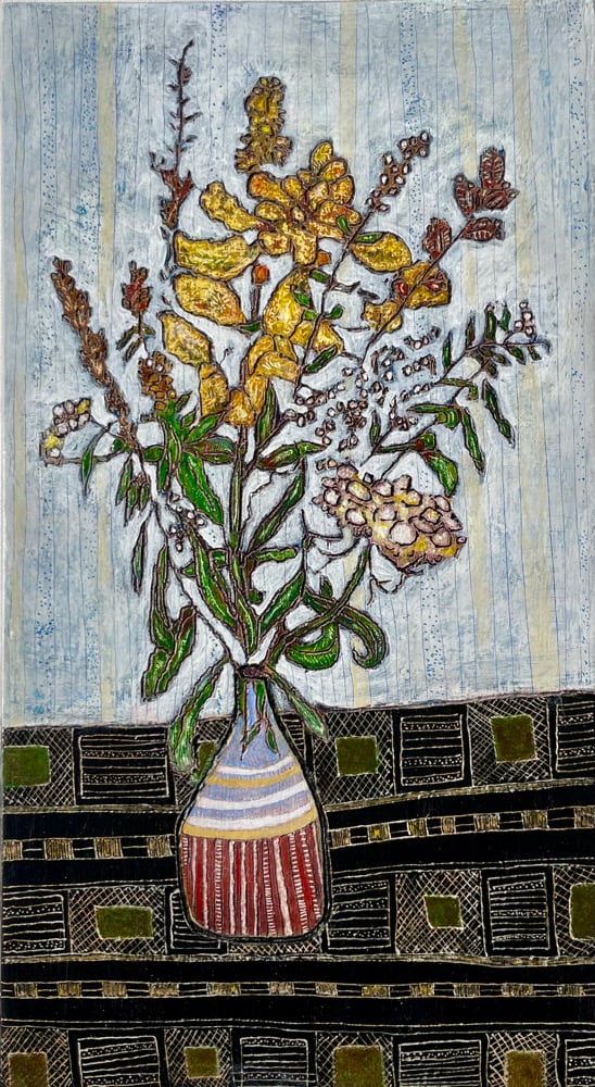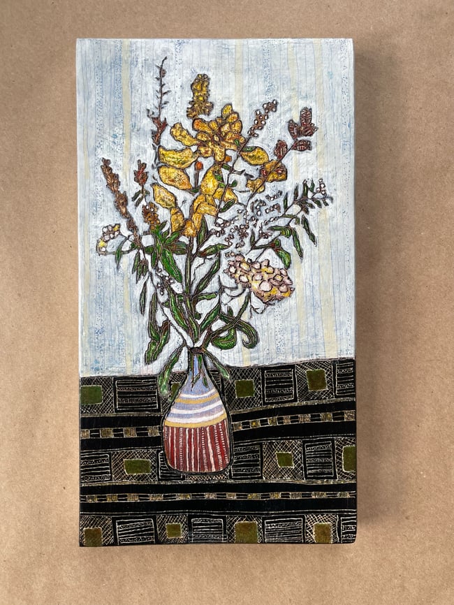This carved painting was inspired by a bouquet of Goldenrod, Queen Anne’s Lace, and Wild Bergamont that I harvested from my childhood home. It is a celebration of fall time beauty and life’s impermanence.