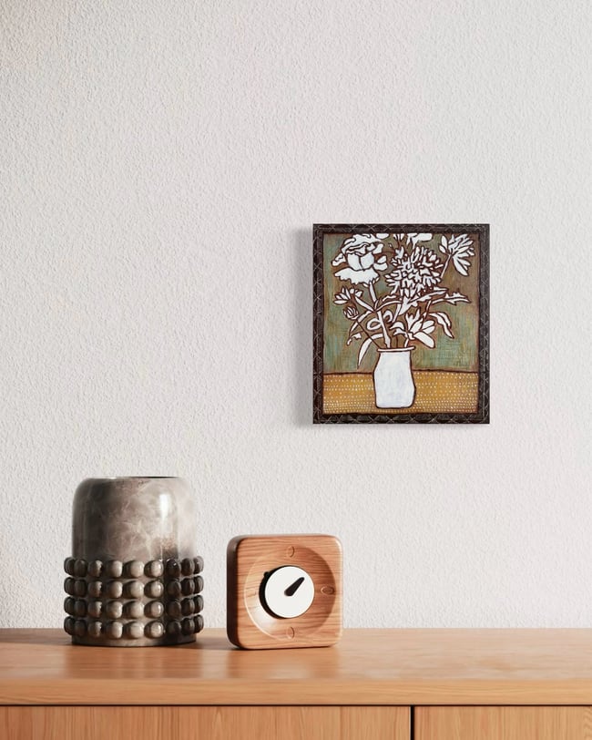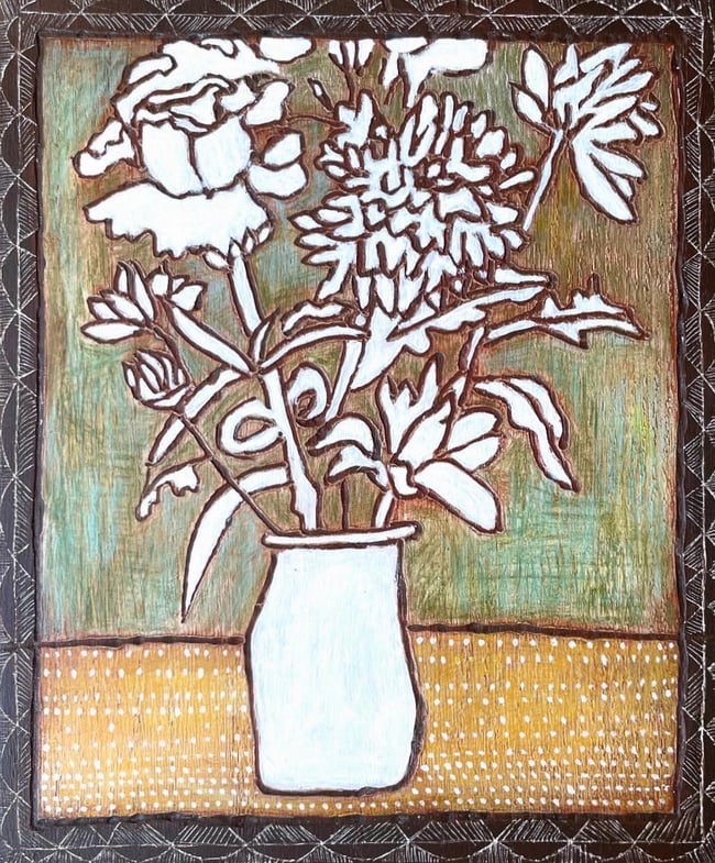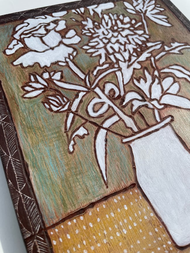 My process began by layering gesso on oak boards. On this clean, white surface, I made an observational drawing of the arrangement. Then, using a wood burner, I engraved the bouquet into the board and sanded it to create a clean surface to paint on. Next, I brought the image to life with acrylic paint and colored pencil. My final step was to scratch fine details into the painting with an x-acto knife.