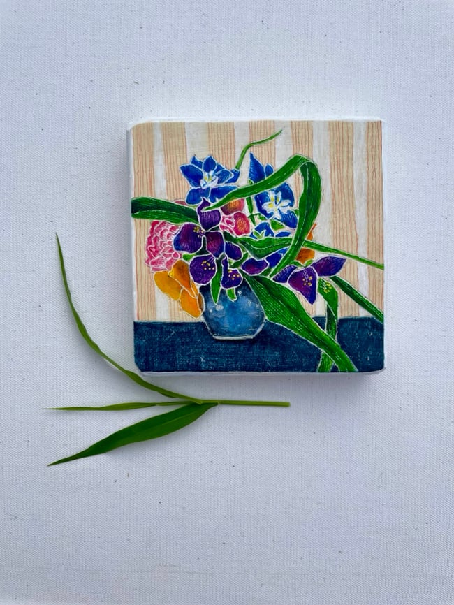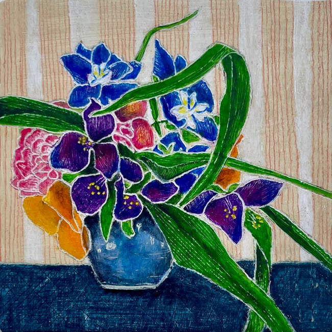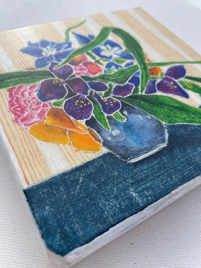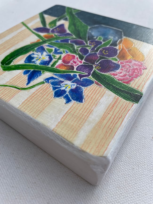 This carved painting was inspired by flowers I gathered from my garden in early July.