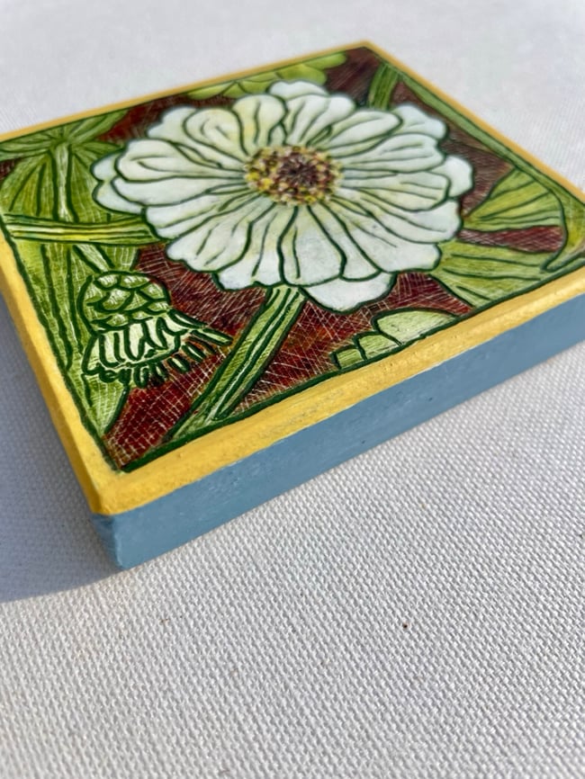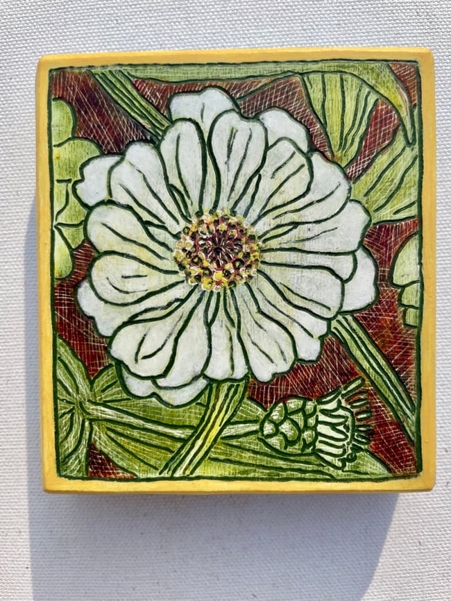 My process began by layering gesso on a poplar board. I then made and observational drawing with my carving tool. After the initial carving was done I layered paint and carving until the painting was finished.
